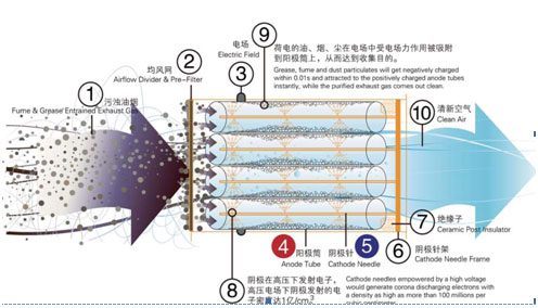 電場的設計使廢氣粒子的運動速度較低,一般在零點幾秒內便能使廢氣粒子荷上足夠的電荷,帶電粒子在電場中會受到電場力(庫侖力)的作用,其結果是油煙粒子被吸附到陽極上。因此凈化率非常高,而且特別適用于捕捉粒徑較小和重量較輕的廢氣粒子。